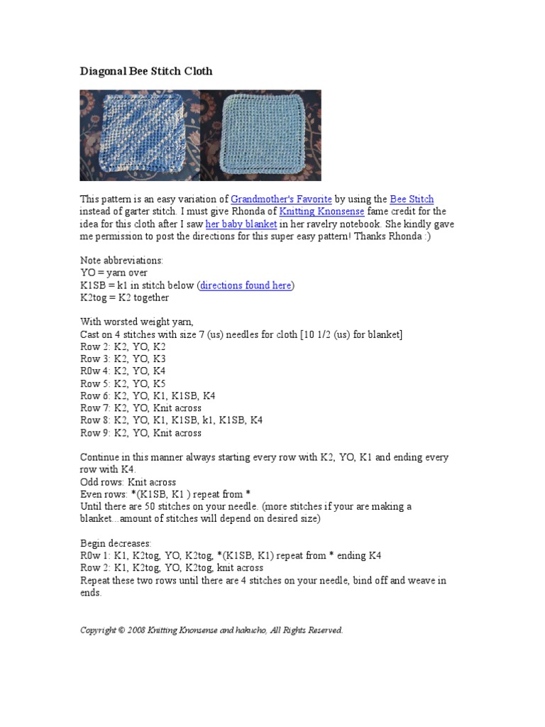Diagonal Bee Stitch Cloth from imgv2-1-f.scribdassets.com Special needles are used to work in rounds. They may be confusing at first, but you will soon learn to follow them. Knitting patterns may have a series of steps that are repeated several times across a row. Going through the back of a stitch is called eastern knitting. Here's how you make a slip knot (see figures 1 & 2). Now we need to stop and take a look at the symbols that are used in knitting patterns. Jan 09, 2012 · i cringe when i see this direction in a knitting pattern without the exact method spelled out: Unless the pattern tells you differently, use the method you were first taught.